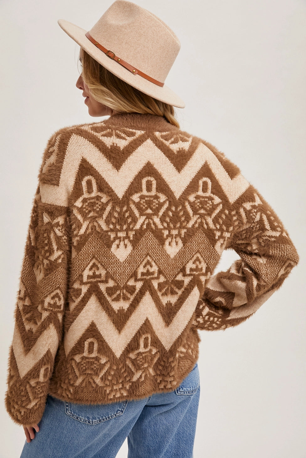 Aztec mock neck knit sweater pullover. This trendy pullover showcases a bold Aztec pattern, adding a touch of flair to your wardrobe. The mock neck design offers a chic look while keeping you warm. With its cozy knit fabric and relaxed fit, this sweater pullover is perfect for casual outings or lounging at home.