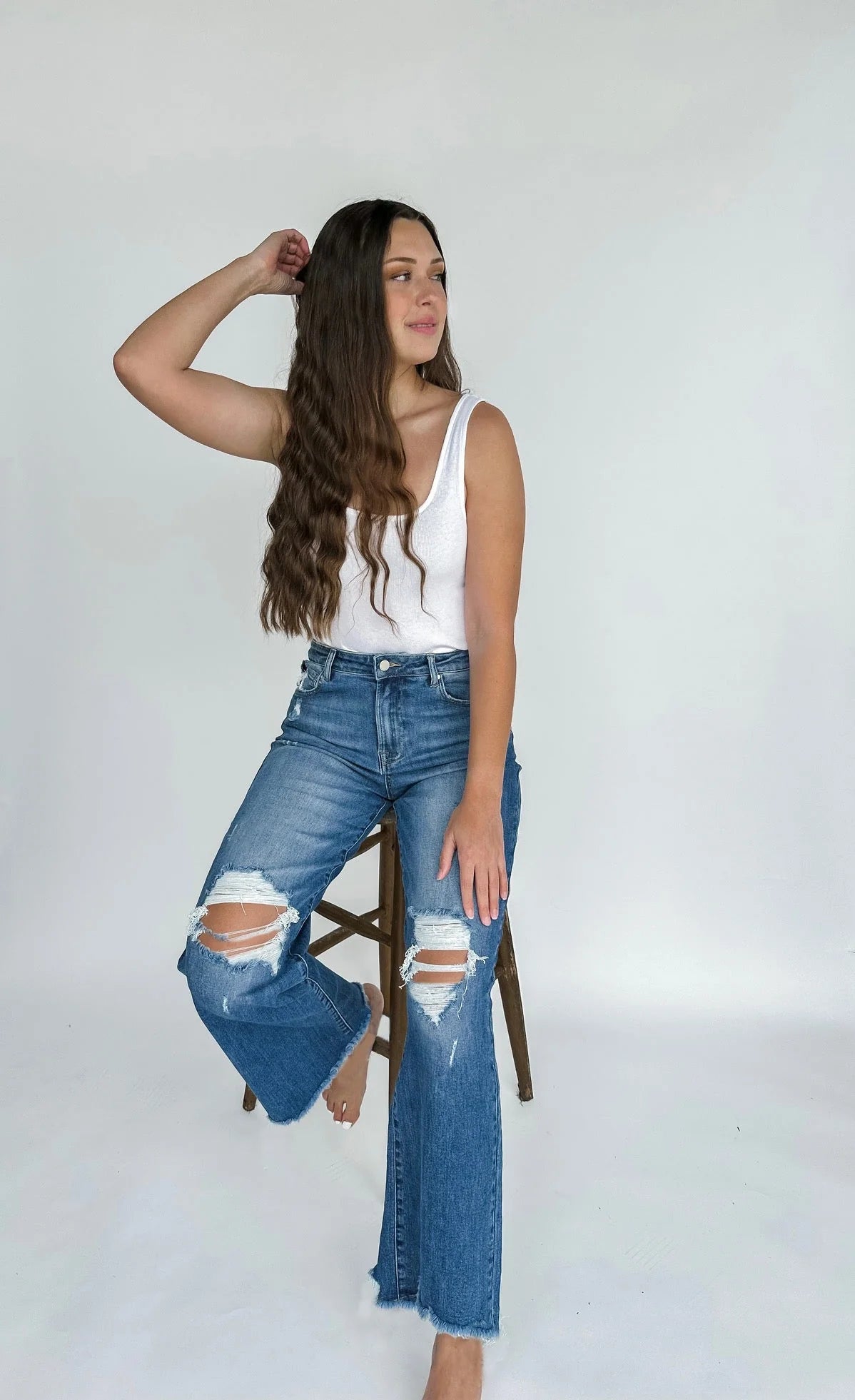 Prepare to fall in love! Your new favorite pair of jeans are here! The stretch is amazing and won’t stretch out and get baggy! Keeps their form just right! Made with premium quality denim with heavy distressing on the knees.