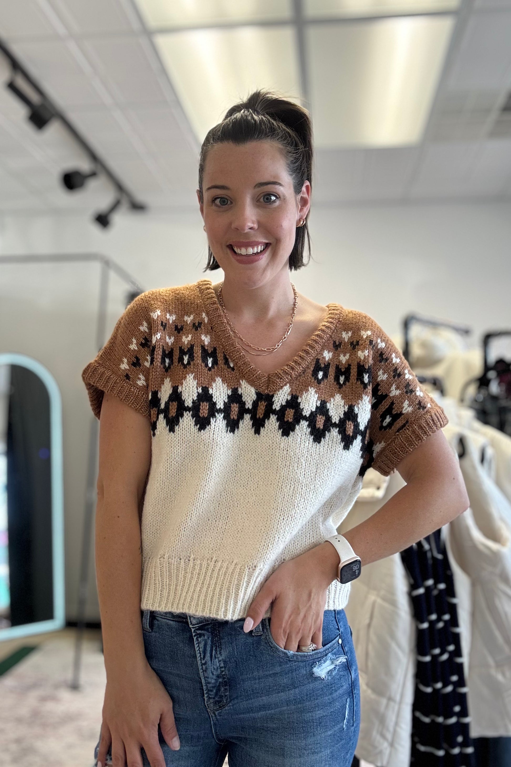 Cozy up in this Fair Isle V-Neck Sweater—your new go-to for fall layering. With its short sleeves, it’s perfect for chilly mornings and warmer afternoons, letting you play with your look without overheating. Add a long-sleeve tee underneath or wear it solo to step into sweater season with a fun twist!