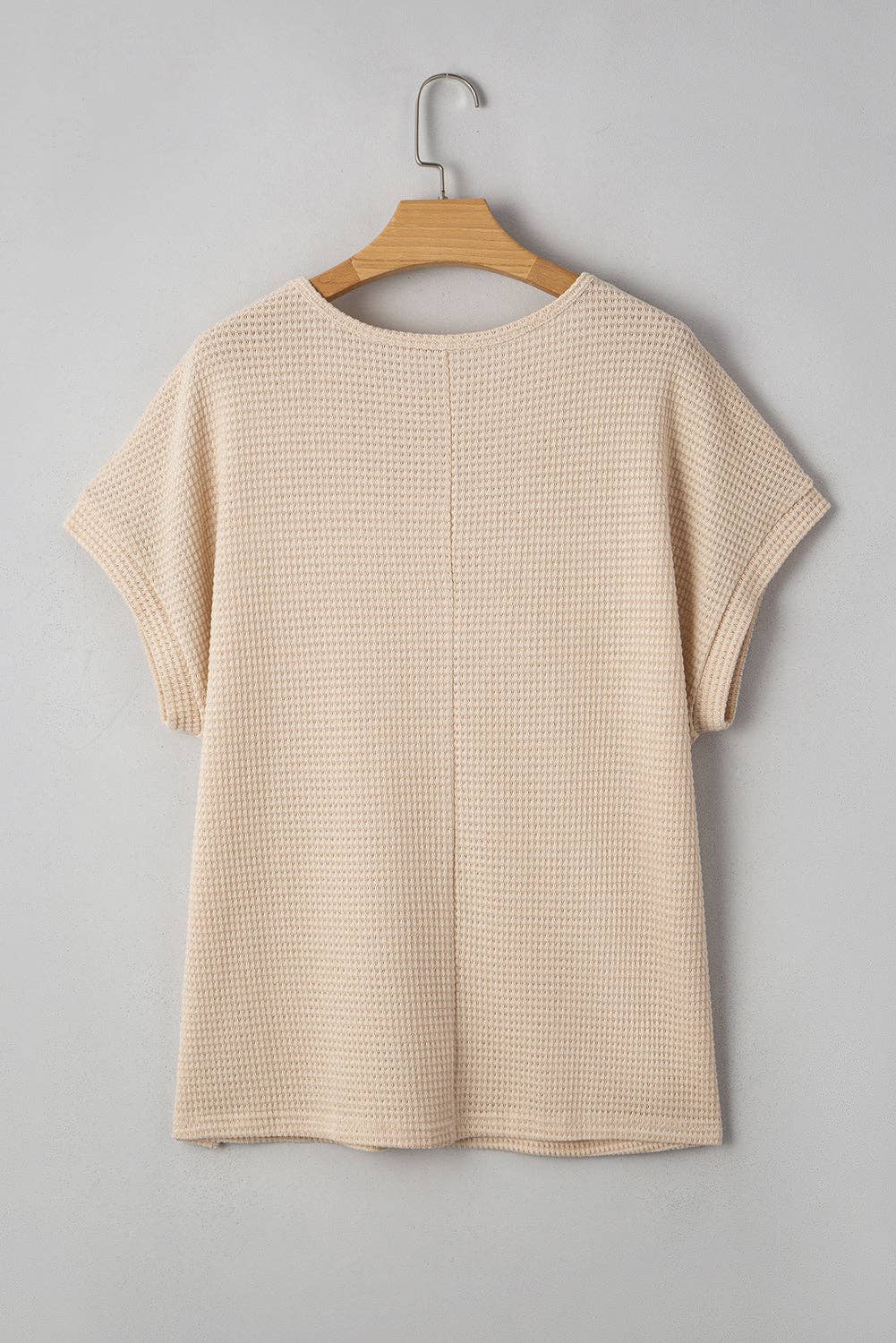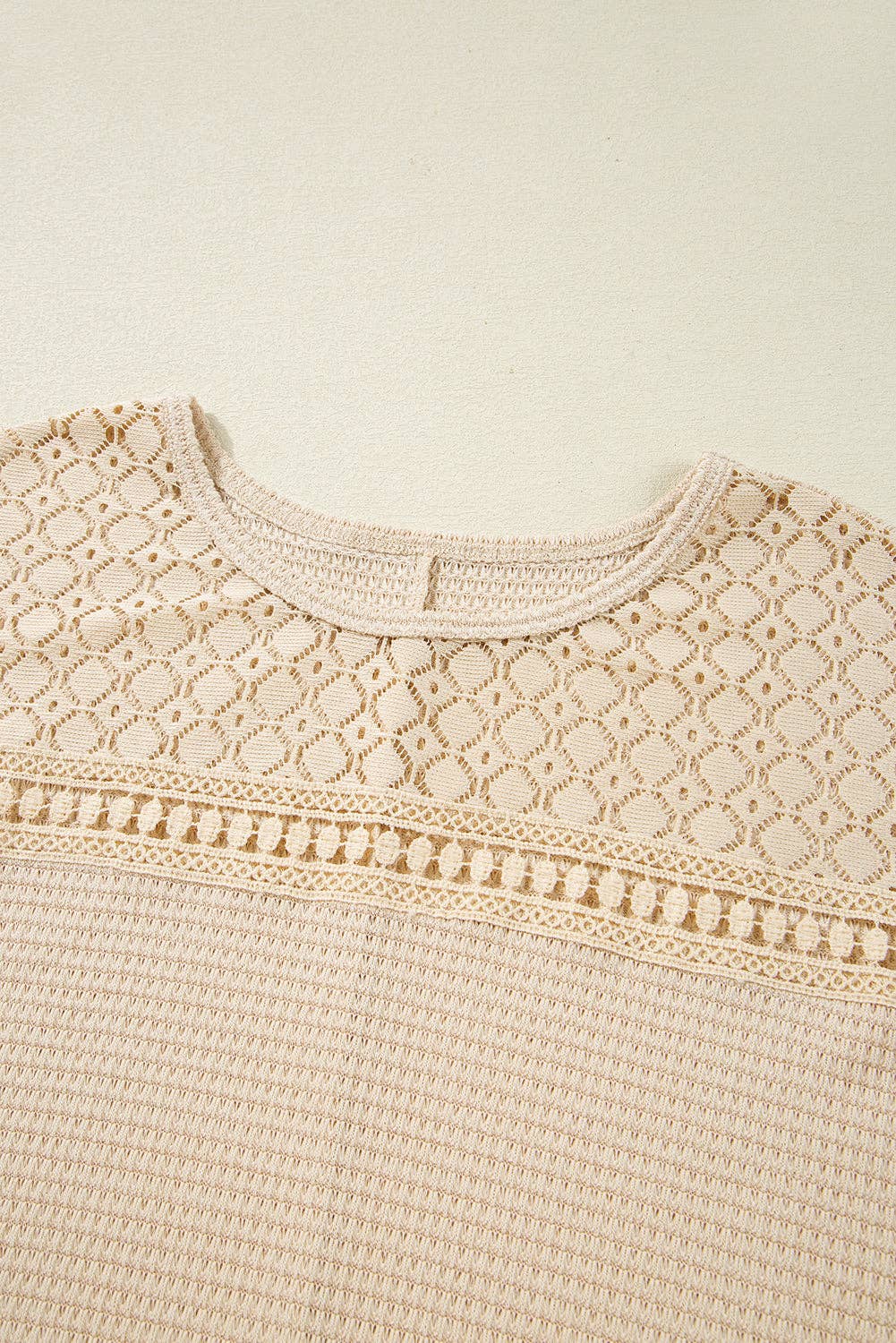Elevate your summer wardrobe with this plus size short sleeve top featuring an elegant lace patchwork design. Crafted from textured waffle knit fabric, it offers a cozy yet refined fit. The flattering cut enhances your silhouette, making it perfect for warm weather or stylish layering.