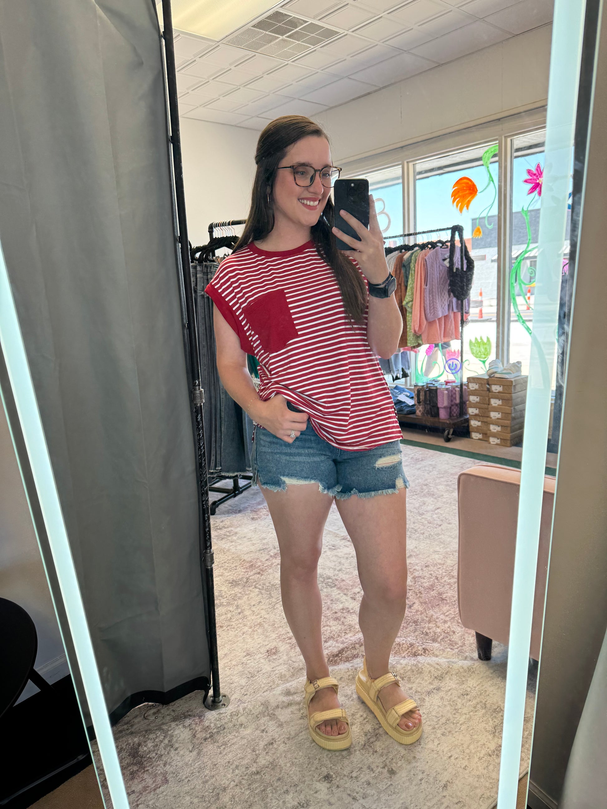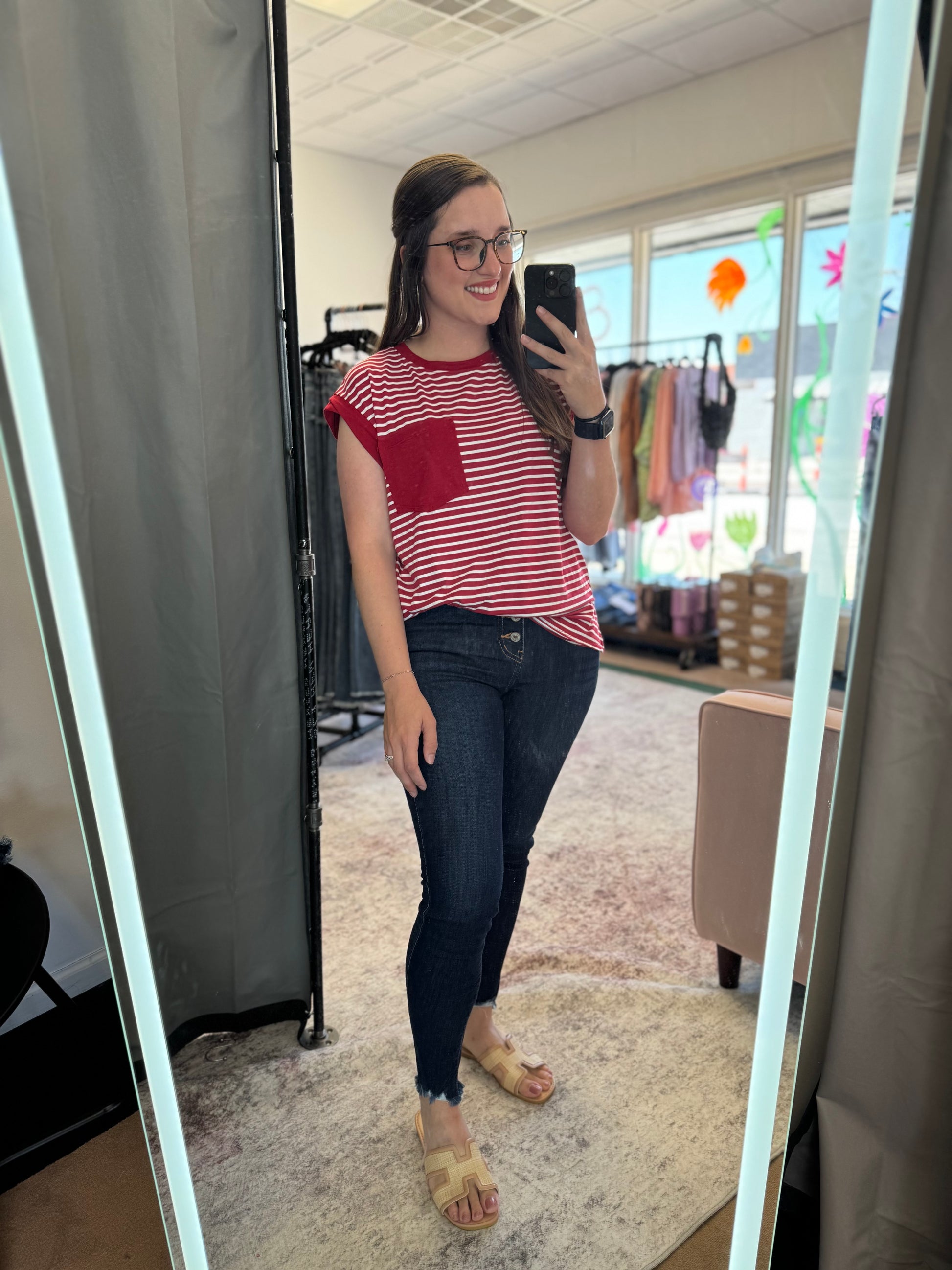 "Get ready for some fun in the sun with our Red Stripe Round Neck Tank! This basic tee will keep you stylish and comfortable, while the playful stripes and chest pocket add a touch of quirkiness. Perfect for any casual occasion, this tank is a must-have for your wardrobe. (But seriously, it's a must-have, trust us.)"