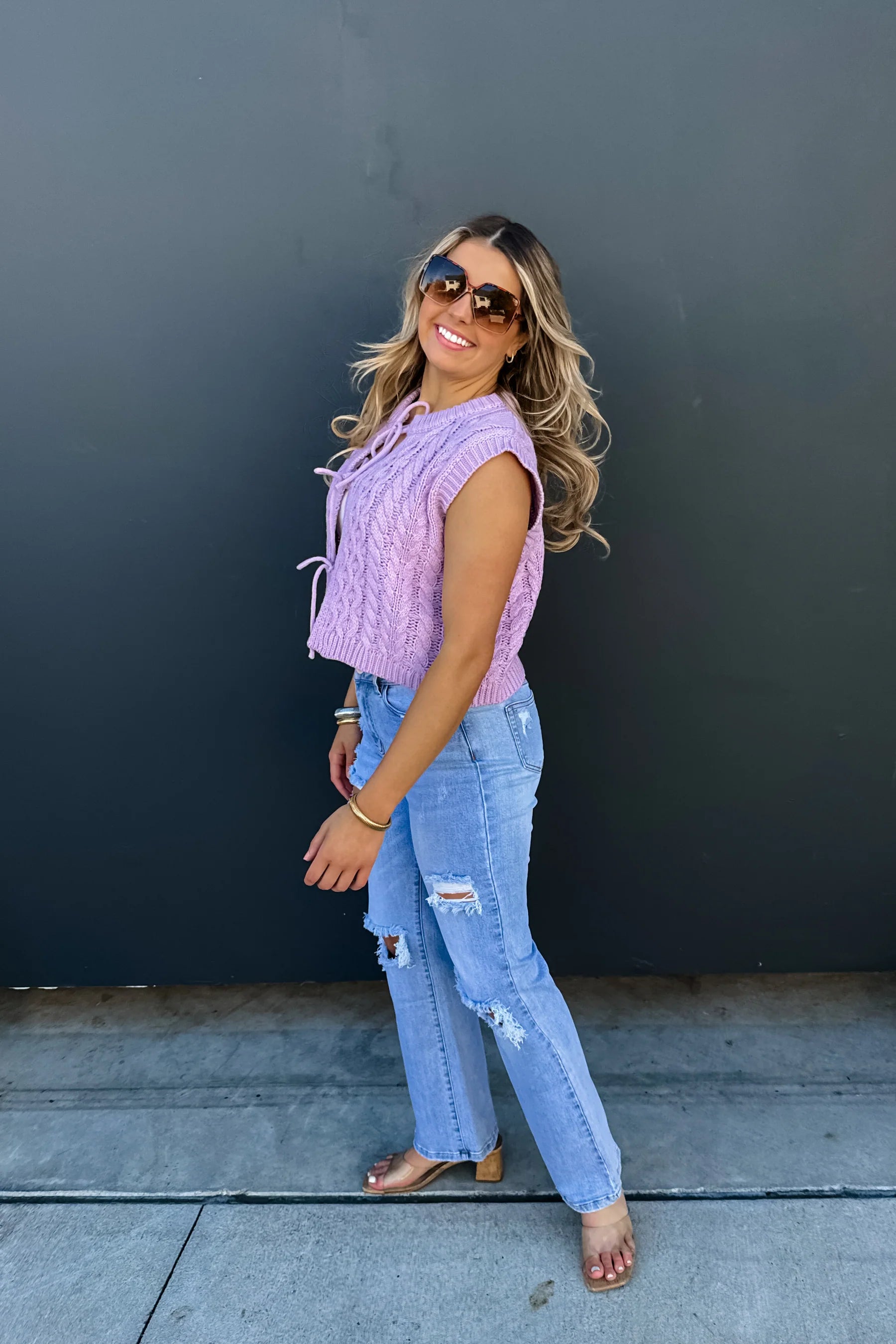 These adorable tie front knit sweater vest are the perfect addition to your wardrobe! Can be dressed up or down, or worn with a long sleeve or tank! Has front working tie strings.