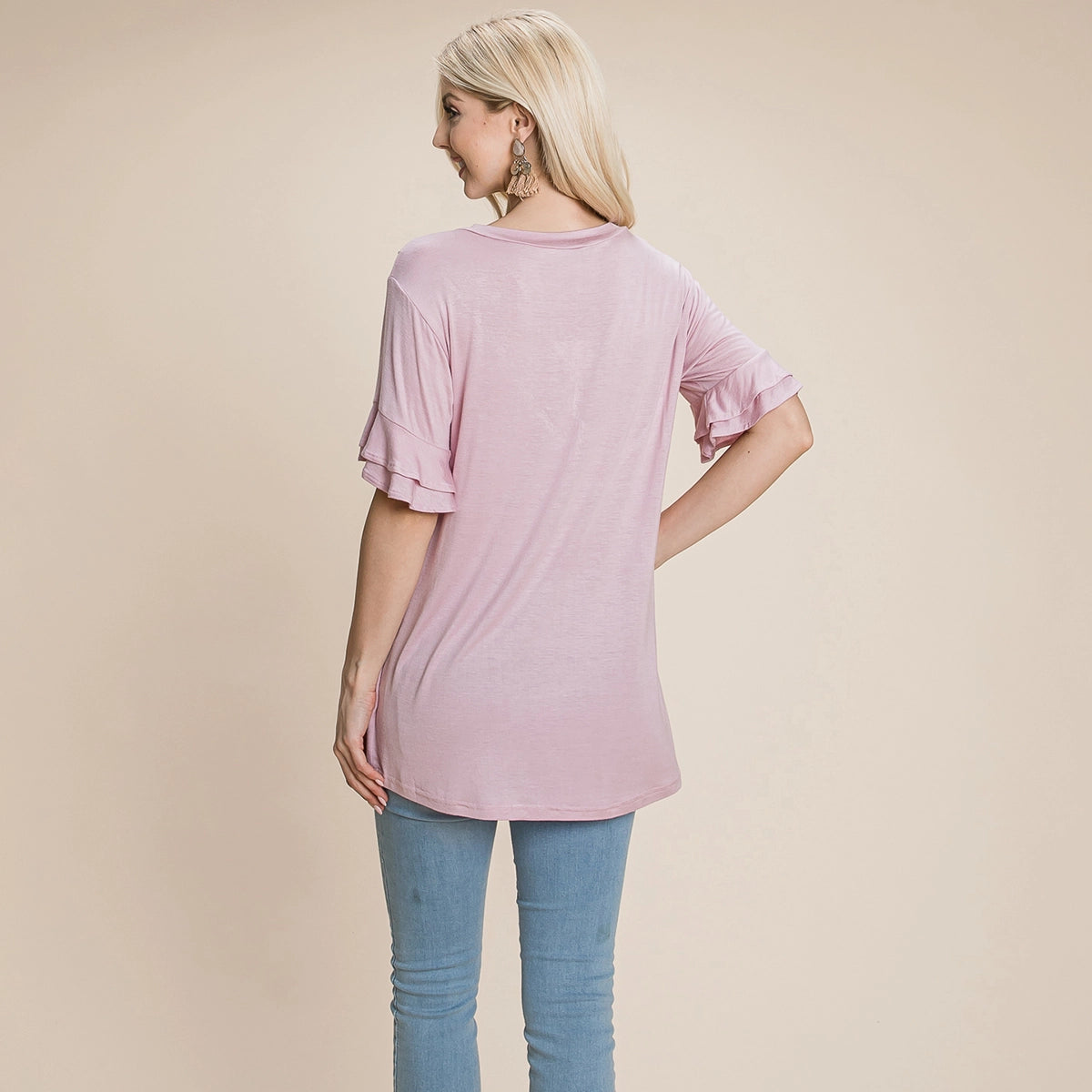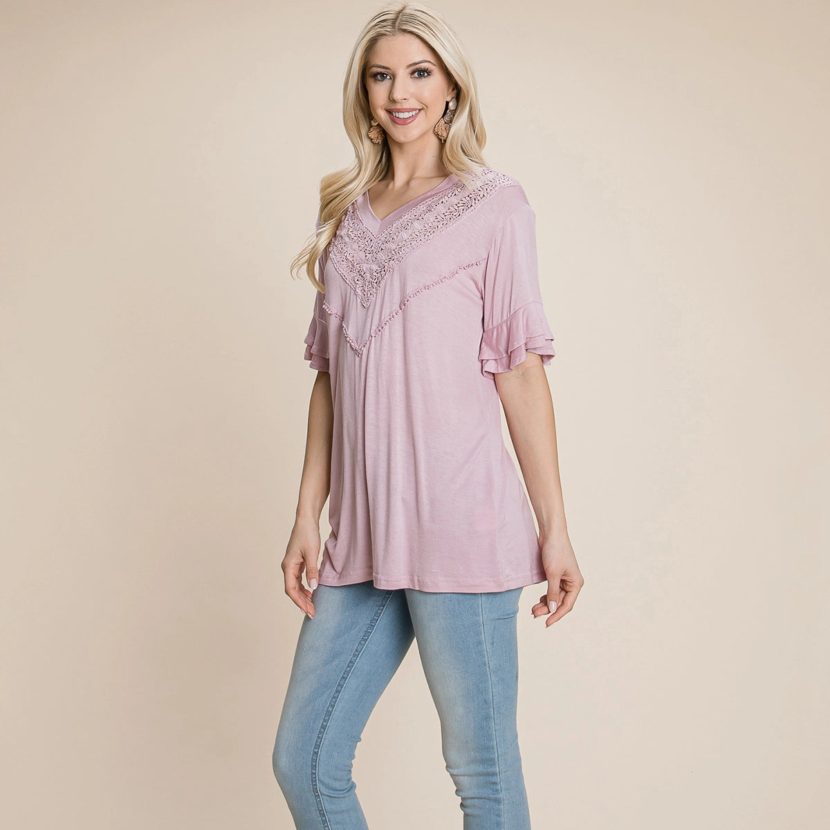 Indulge your senses with our V Neck Lace Trim Front Top. Designed with flowy and ruffle sleeves, this top is perfect for any casual occasion. The delicate lace trim adds a touch of elegance and its versatility makes it a must-have in any wardrobe. Comfort and style in one!